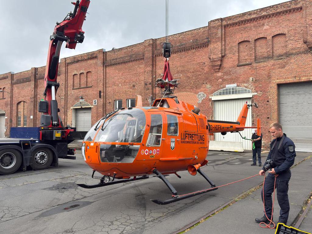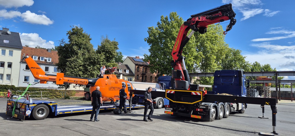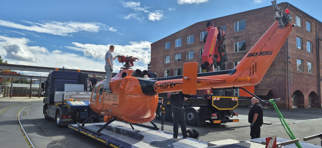Dank gebührt u. a. der Bundespolizei aus Bonn-Hangelar, welche den Hin- und Rücktransport der BO105 von Kassel nach Duisburg und zurück mittels eines LKW-Tiefladers und eines LKW-Krahn auf hoch professionelle Weise durchgeführt hat.
